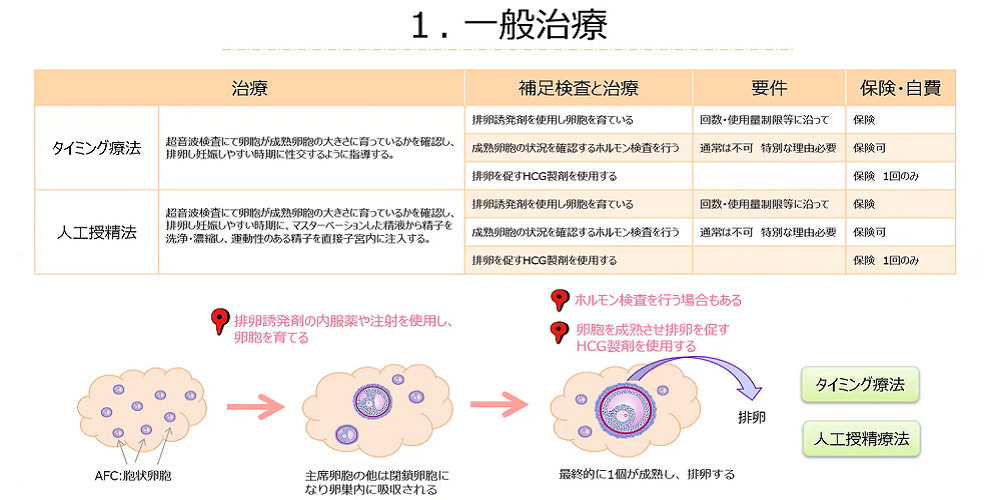 不妊の一般治療には、タイミング療法と人工授精療法があります。基本検査の結果で精子の数や運動率が正常の場合はタイミング療法、精子の数や運動量が不良の場合は人工授精療法から始めるケースが多いでしょう。