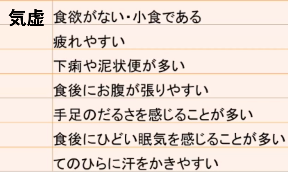 気虚の人の症状は、ここにまとめていますが、例えば疲れやすい方です。気虚というのは、気の巡りが悪いのと、あと「気」自体が足りないんですよ。なので疲れやすかったり、食後にお腹が張りやすかったり、食べた後に眠気がしたりとか、こういった症状がある人が気虚ということになります。