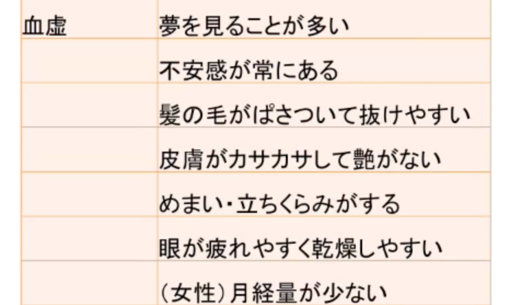 血の量が足りないのは血虚ということで、血虚の人に当てはまるものとしてはめまいがする、目が疲れやすい、髪がパサパサするとか、そういったことがあります。