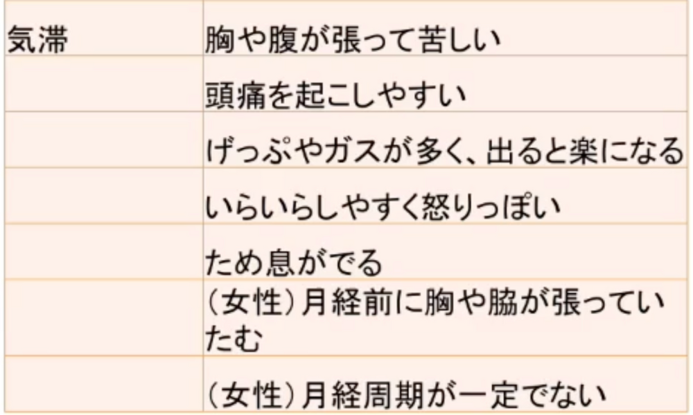 そして最後に気滞ですね。「気」の動きが悪い、「気」が滞ってしまったような人の中には、胸やお腹が張って苦しい、頭痛にやりやすい、イライラして怒りっぽい、月経の時期に、胸が張ったり脇が張ったり、そういった状態がある方が多いと言われています。