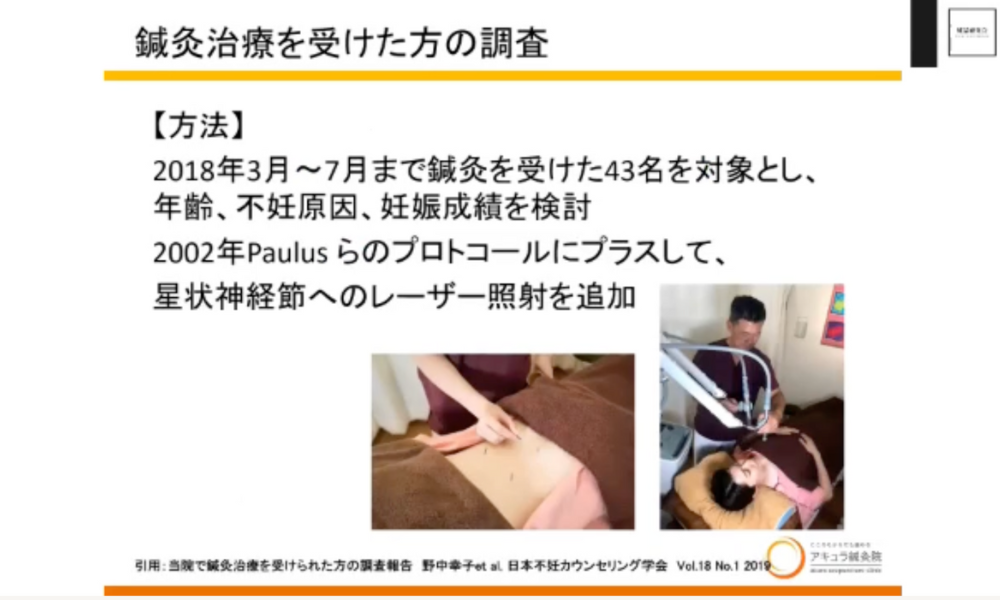 その他、鍼が何で効くのかについてですが、これは私たちが、京野アートクリニックで鍼灸を提供しており、2019年の日本不妊カウンセリング学会で発表した内容です。