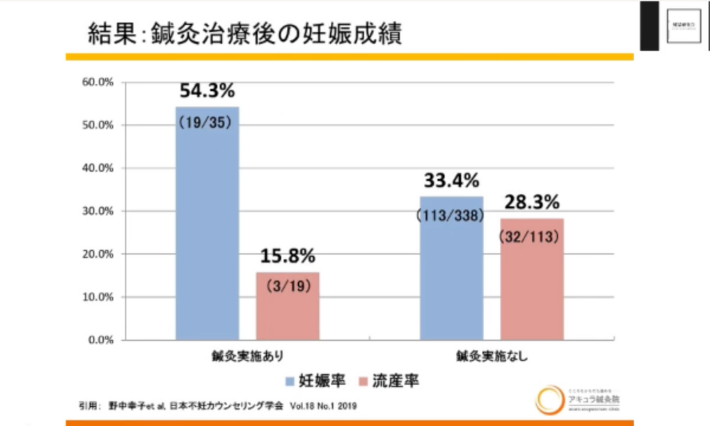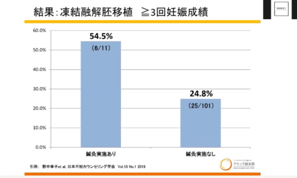 すごい結果が出たのが3回以上不成功の方が鍼をしている群です。鍼をしている群が54%、鍼をしてない群が24%ということで、この鍼をしている群の妊娠率がいいという結果になっています。
