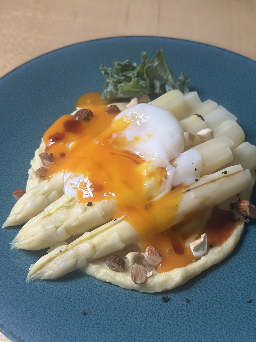 ⑥お皿にポテトとアスパラガスを盛り付け、温泉たまごを添える、好みでナッツや、お塩、お醤油などで味の変化をお楽しみください。