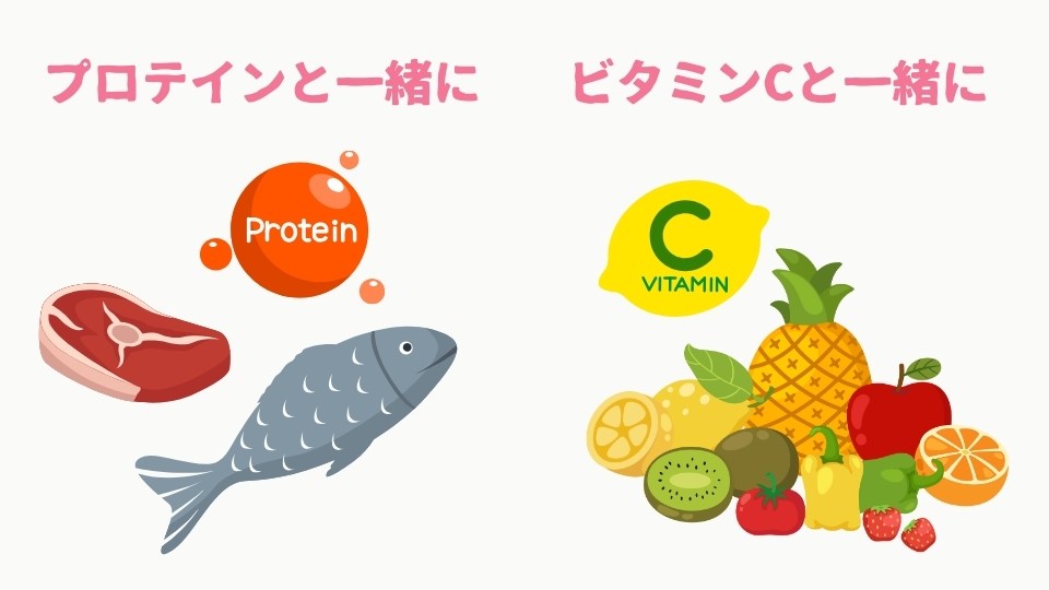 吸収率の低い非ヘム鉄も、食べ合わせを工夫することで効率よく摂取できます。ポイントは「ビタミンC」と「動物性たんぱく質」です。
