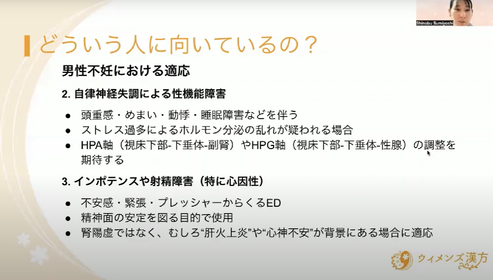 精神的な不安や緊張が、生殖機能(漢方では「腎」が深く関わります)に悪影響を及ぼしている状態です。頭では分かっていても、心の乱れが身体、特に性機能の低下に直結してしまっていると考えます。