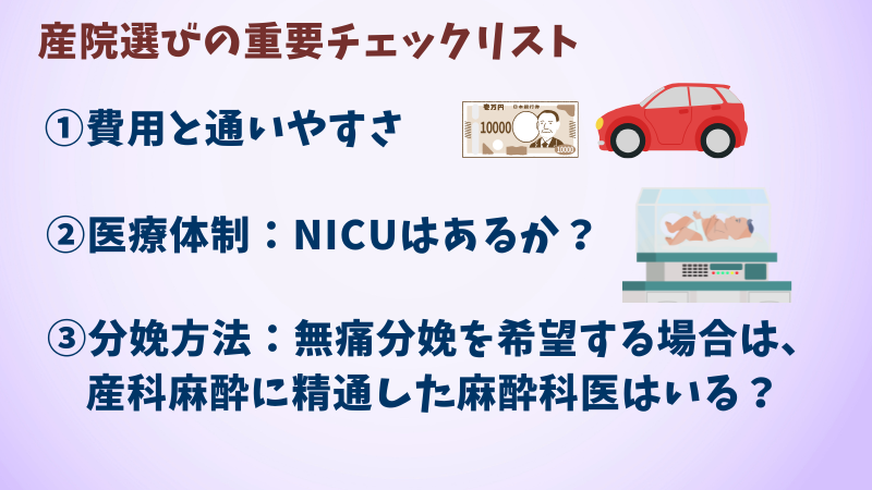 数ある産院の中から自分に合った施設を選ぶために、必ず確認すべき3つのポイントをご紹介します。