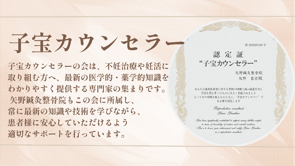 矢野鍼灸整骨院の院長は、「統合医療生殖学会認定の子宝カウンセラー」として、不妊治療や妊活に取り組む方を専門的にサポートしています。お一人おひとりの体質や生活習慣を丁寧に伺い、東洋医学の視点から身体の状態をしっかりと把握。