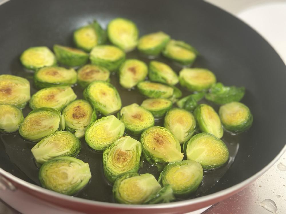 ②焼き目がついたら芽キャベツを返して水でといた出汁を入れ蒸し焼きにする