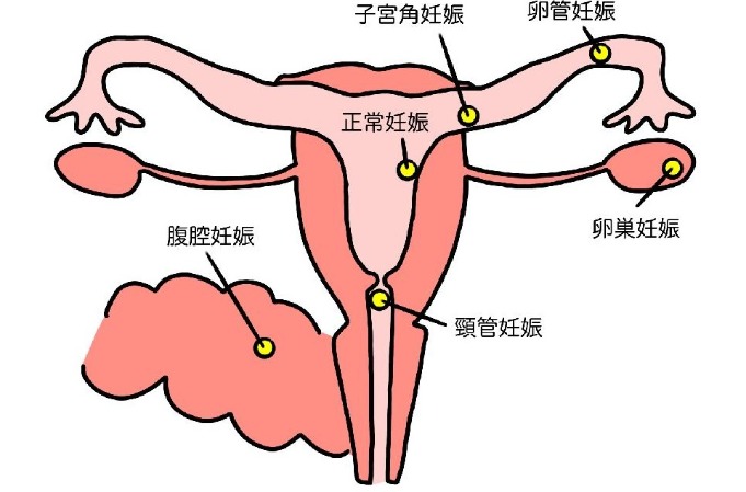 子宮外妊娠の95%以上は、卵管で起こる「卵管妊娠」です。その他、稀に卵巣、腹膜(お腹の中)、子宮頸管などに着床することもあります。